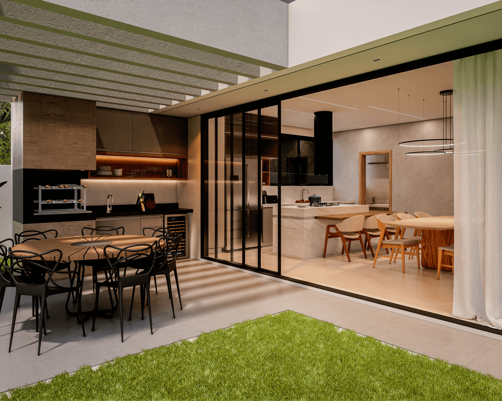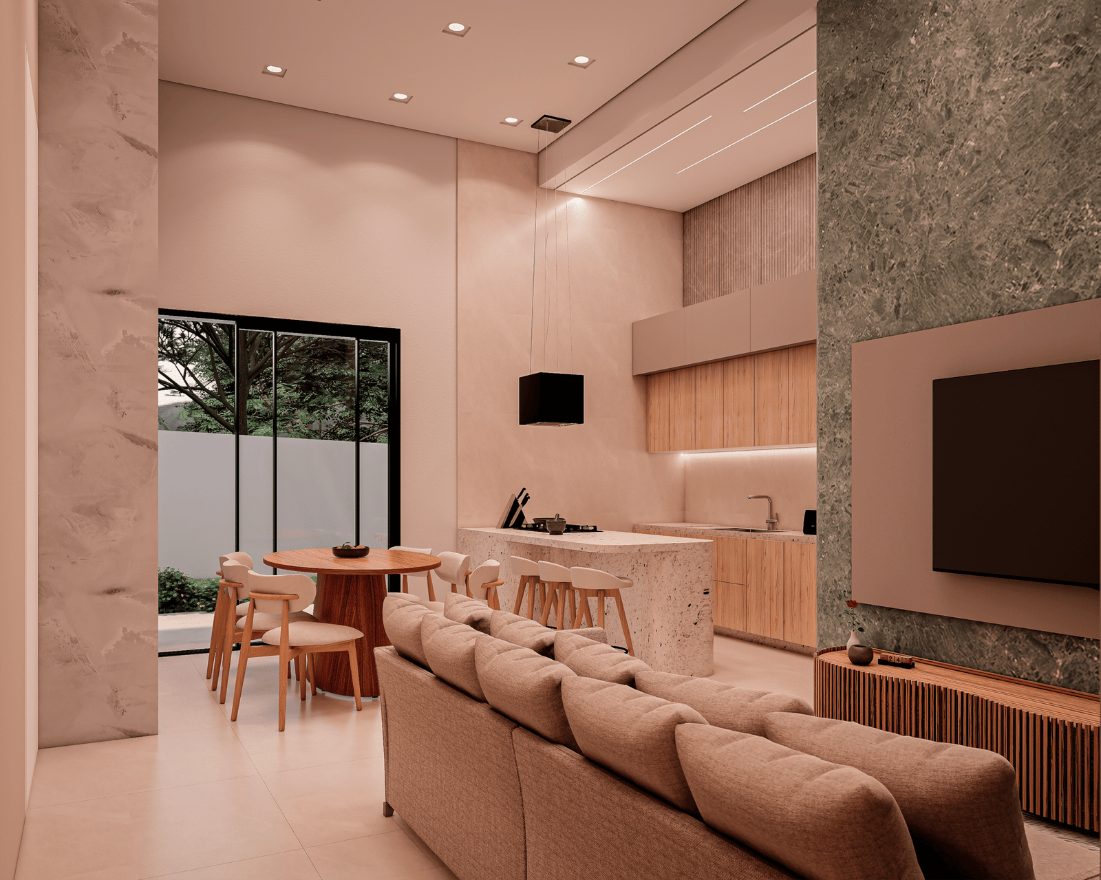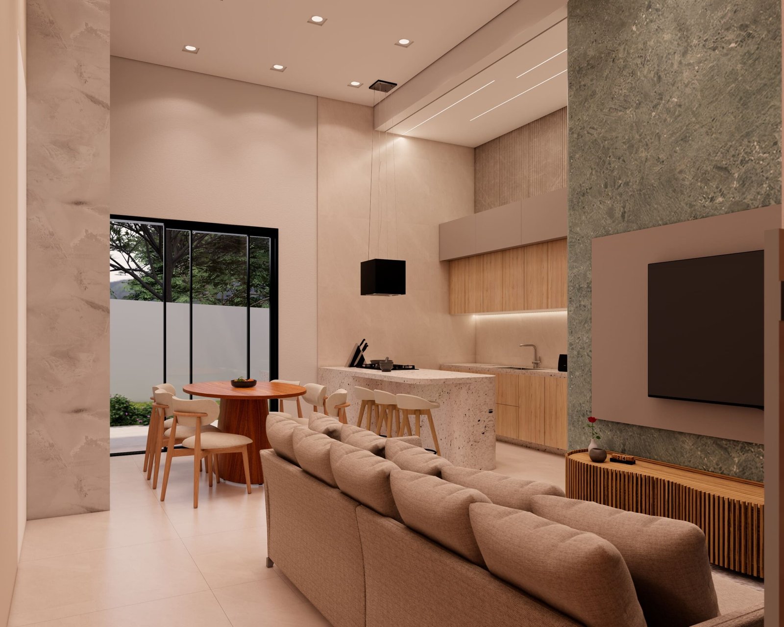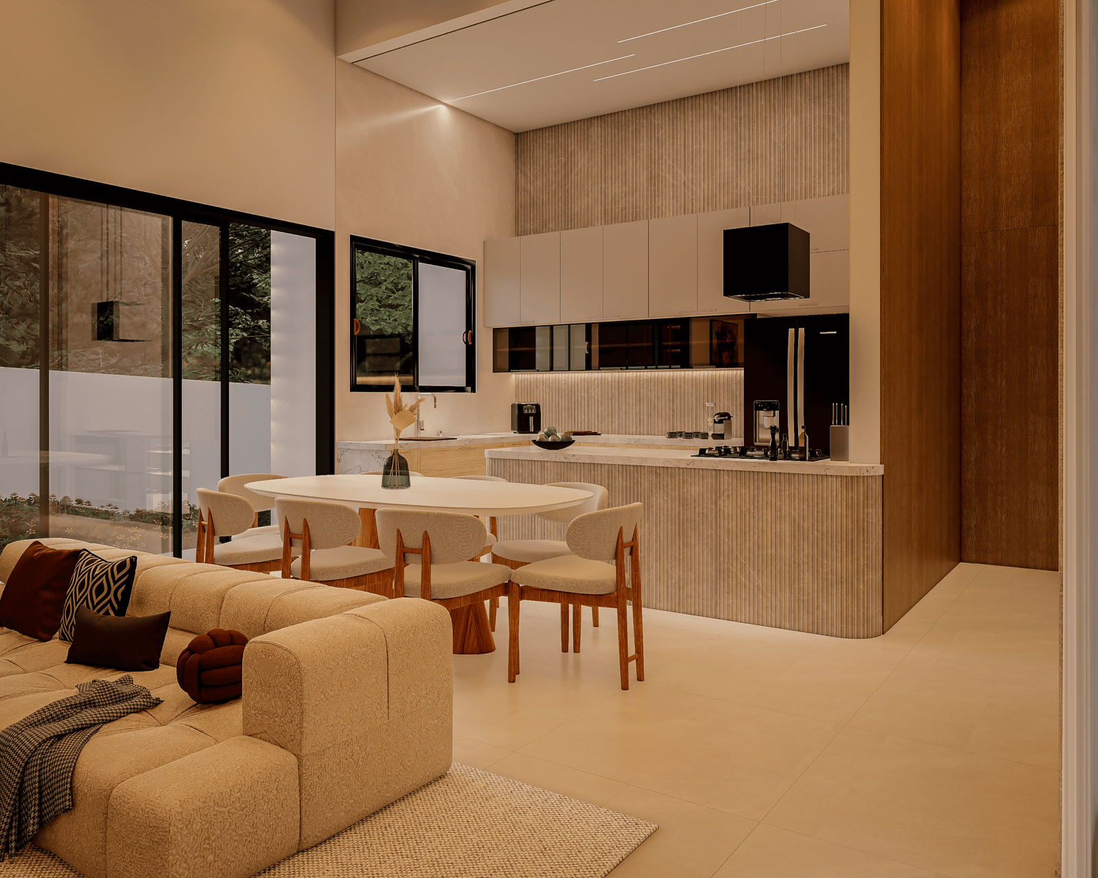 Com acabamentos de padrão premium e um projeto de iluminação sofisticado, o Modelo 5 une luxo e modernidade em cada detalhe. O destaque principal é a integração total dos ambientes, proporcionando amplitude e convivência para quem não abre mão da exclusividade.