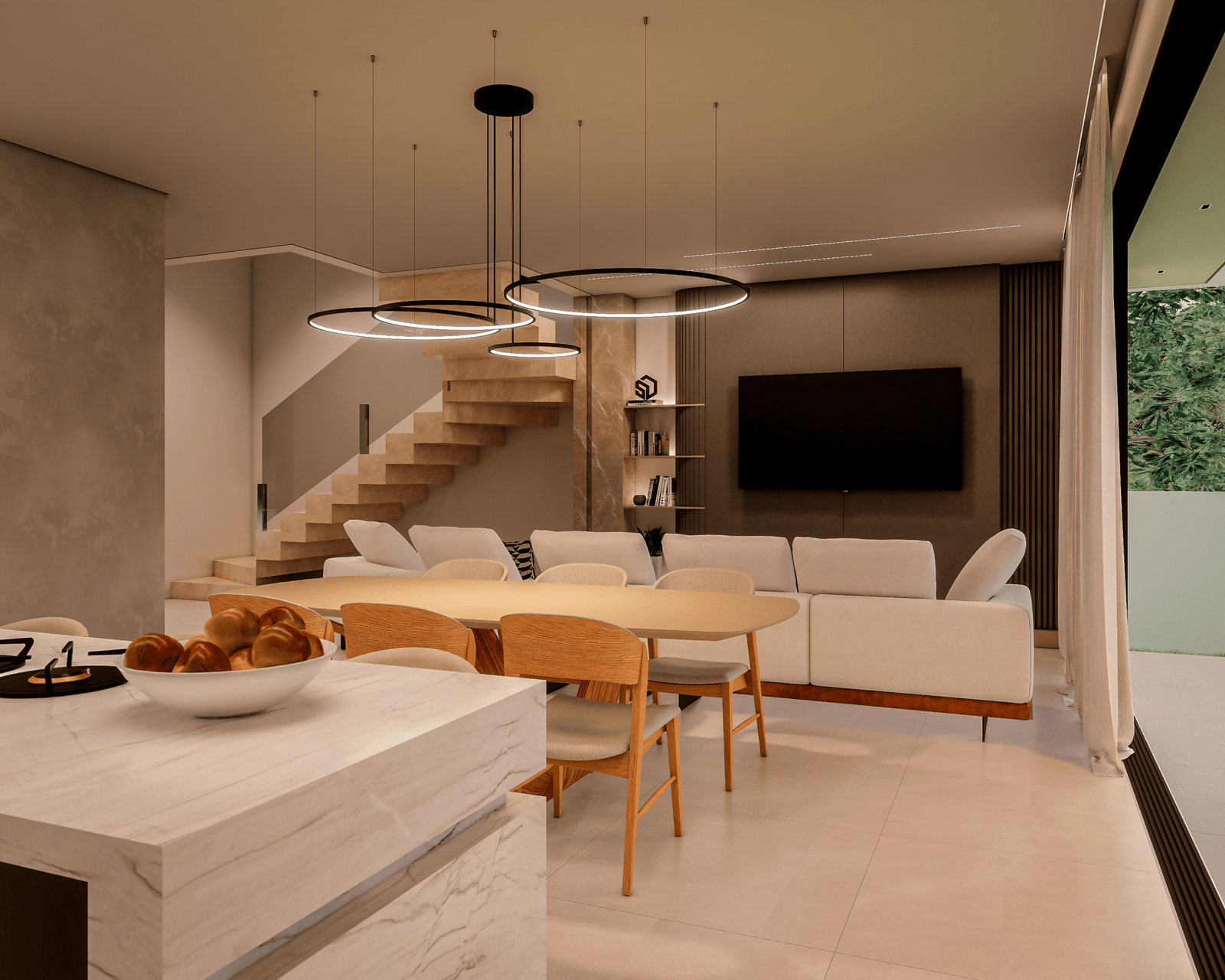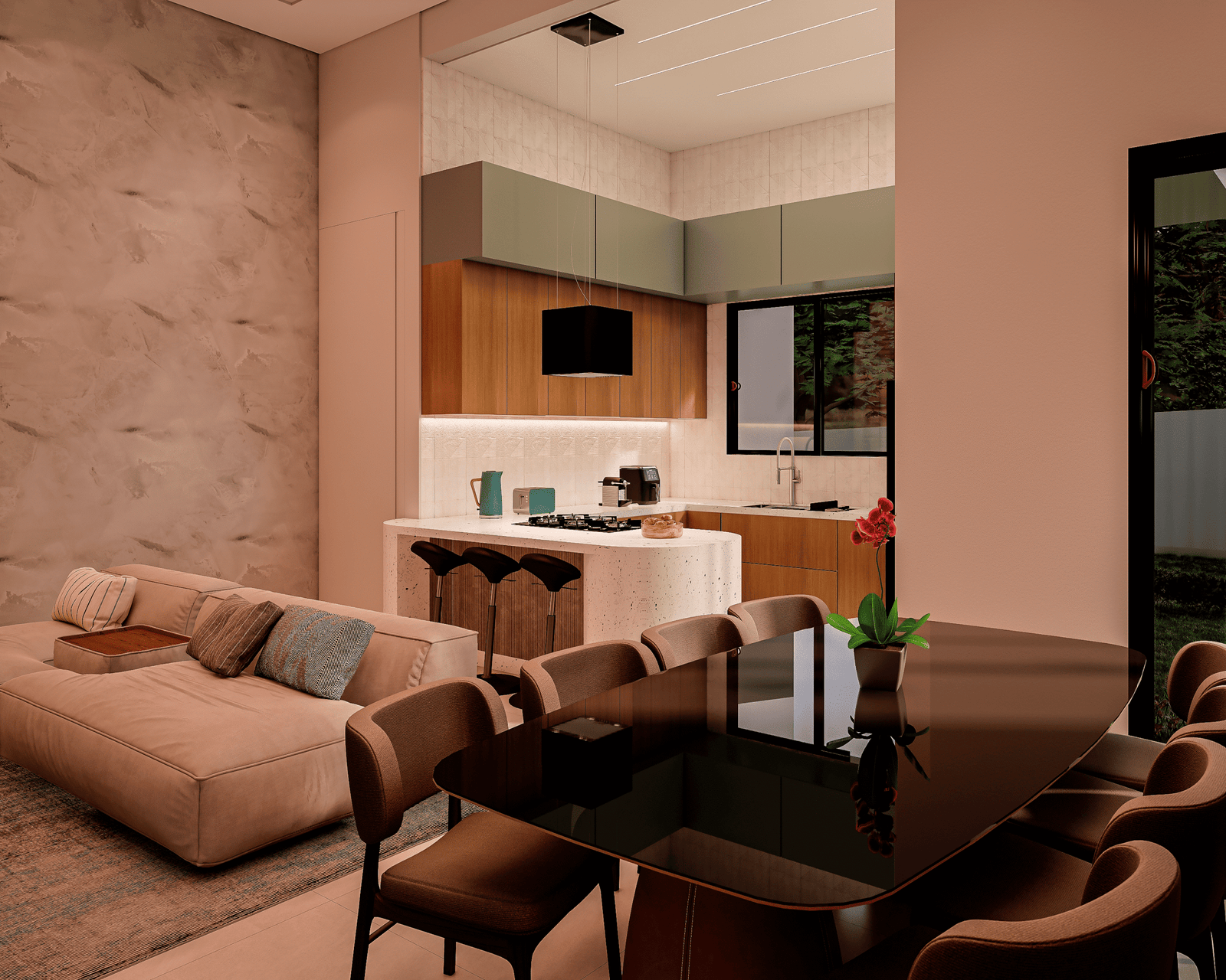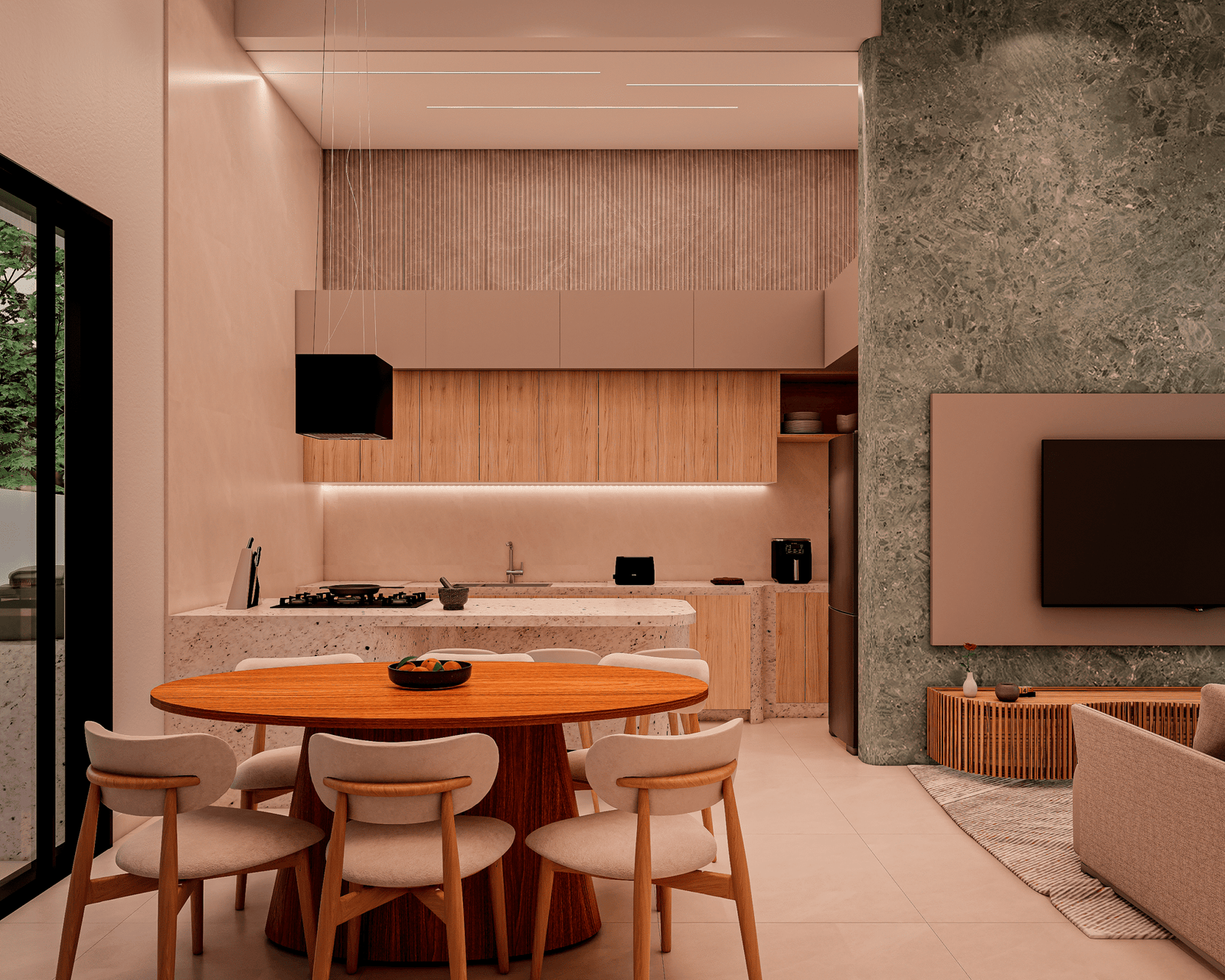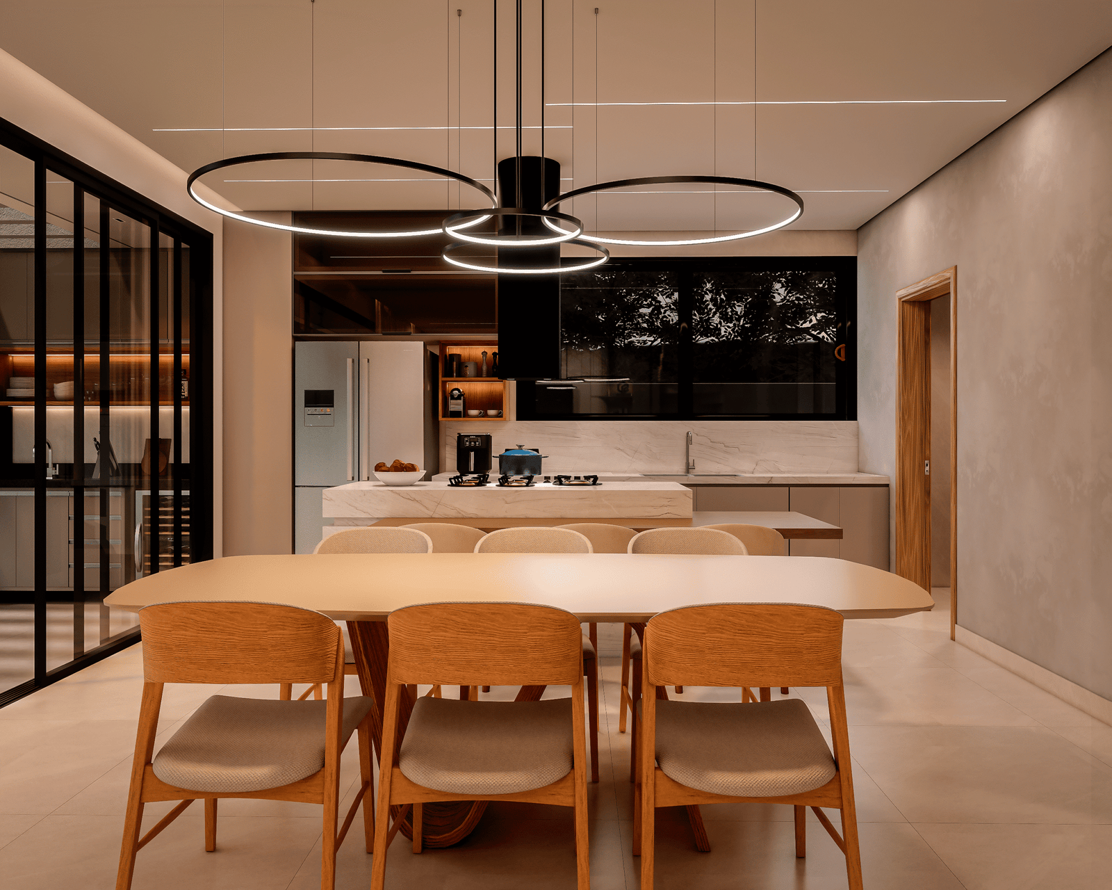 Com acabamentos de padrão premium e um projeto de iluminação sofisticado, o Modelo 5 une luxo e modernidade em cada detalhe. O destaque principal é a integração total dos ambientes, proporcionando amplitude e convivência para quem não abre mão da exclusividade.